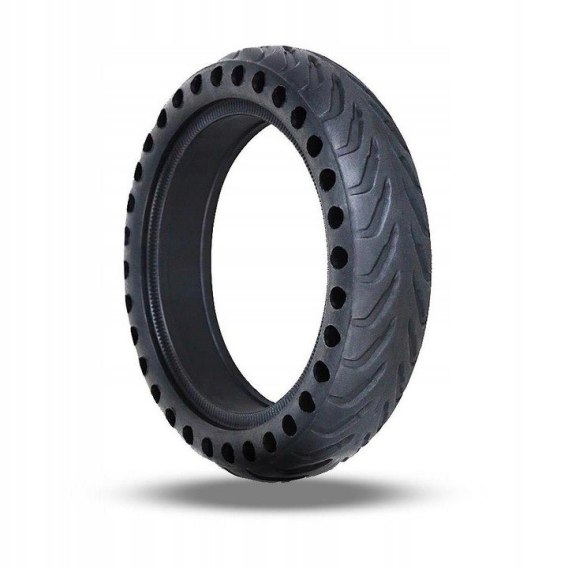 Opona bezdętkowa, pełna. Opona została odpowiednio wyprofilowana, a otwory zostały nawiercone w taki sposób  aby zapewnić właściwości zbliżone do opon dętkowych.
